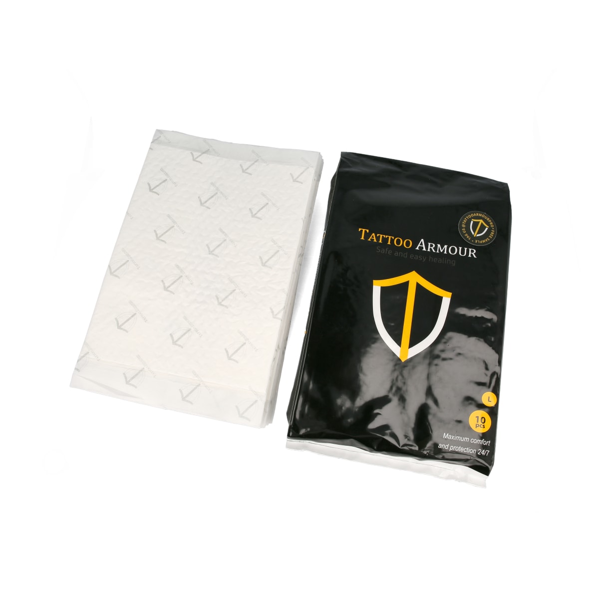 The Tattoo Armour Pad to support the wound healing of fresh tattoos is available in two sizes.